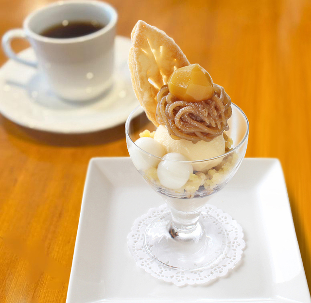 自慢の栗と栗あんを惜しみなく使ったモンブランパフェ。コーヒーと栗あんを合わせた特製プリンも贅沢に重ねました。